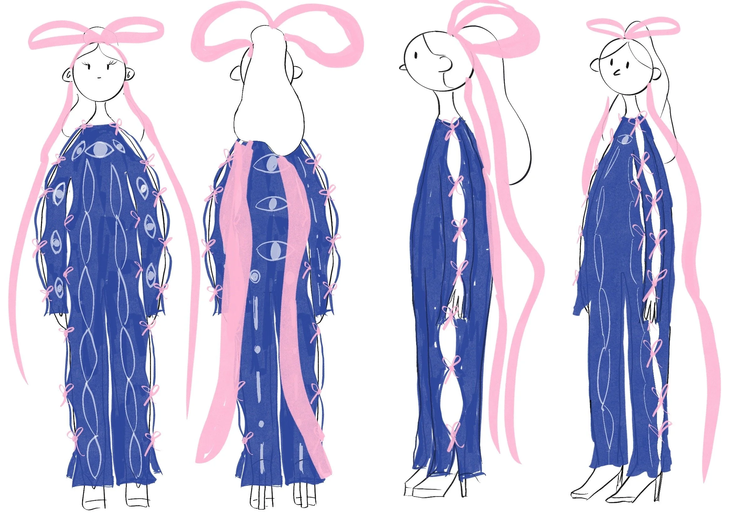 Ich habe mich dafür entschieden, den ganzen Anzug mit Schleifen schließbar zu machen. Bedruckt wurde der Stoff per Cyanotypie, die bei einem Picknick im Park entstanden ist.
